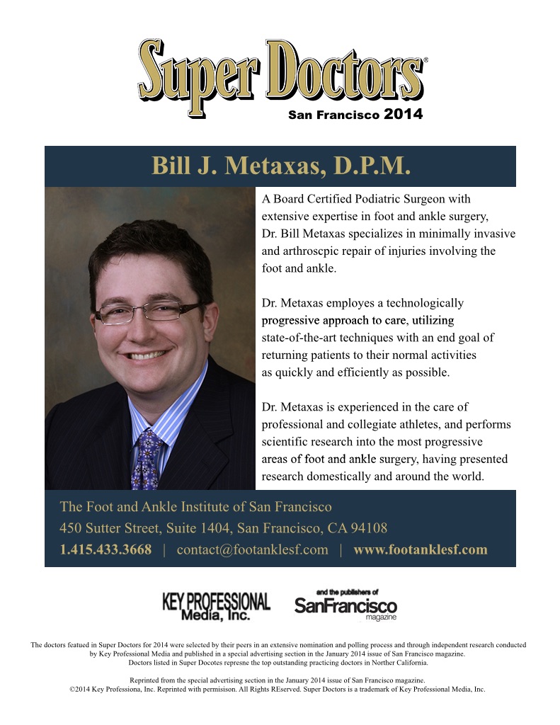 Dr. Bill J. Metaxas is a Board-Certified Podiatric Foot and Ankle Surgeon and the principal of San Mateo Podiatry Group; his practice includes a variety of medical and surgical issues relating to the foot and ankle, from sports medicine and acute injuries, to post traumatic complex limb deformities.